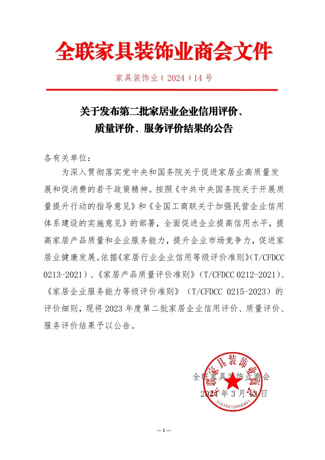 3月12日,全联家具装饰业商会发布《关于发布第二批家居业企业信用评价、质量评价、服务评价结果的公告》,对家居行业最具影响力的家居装饰、建材企业等进行客观性、公正公开、权威性的评价。