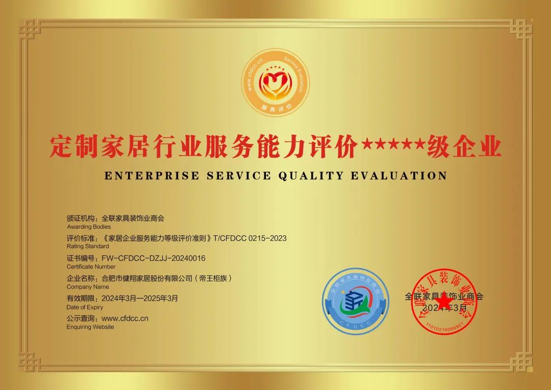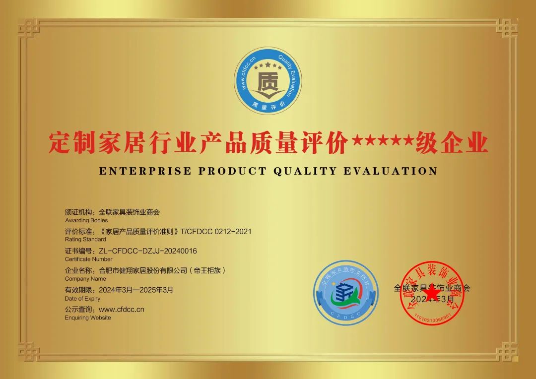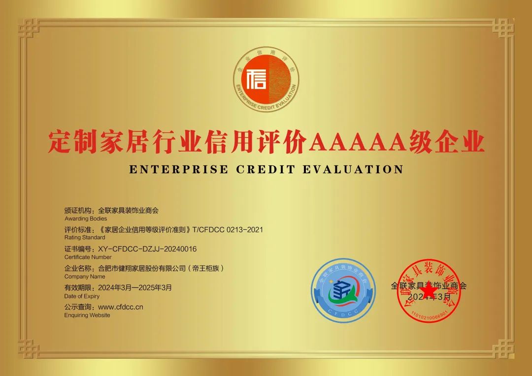 其中,合肥市健翔家居股份有限公司(帝王柜族)凭借卓越的产品质量、出色的服务能力和良好的商业信用,一举揽获定制家居行业服务能力评价★★★★★级企业、定制家居行业信用评价aaaaa级企业、定制家居行业产品质量评价★★★★★级企业三项殊荣。